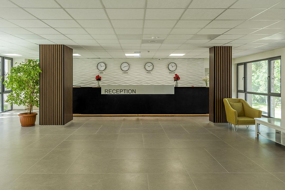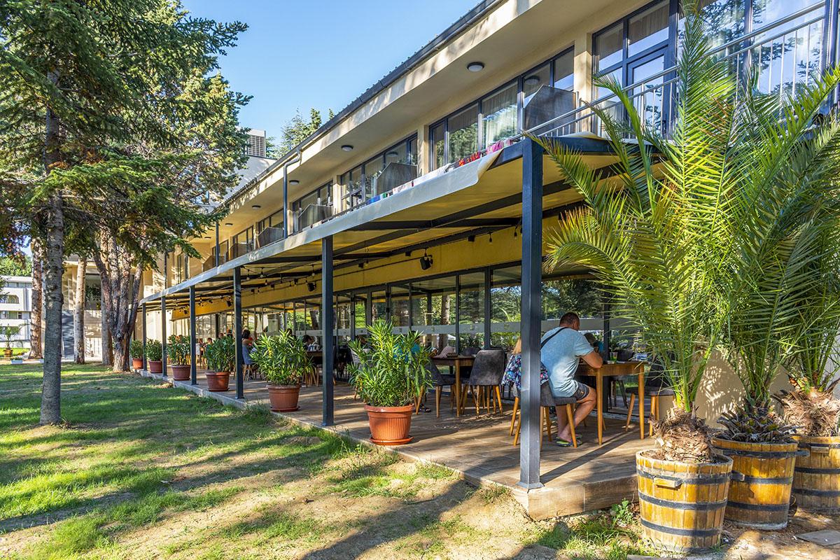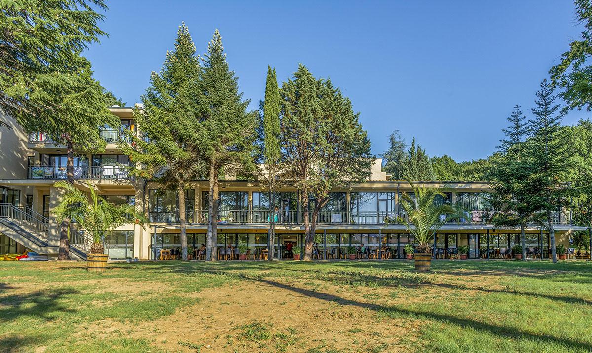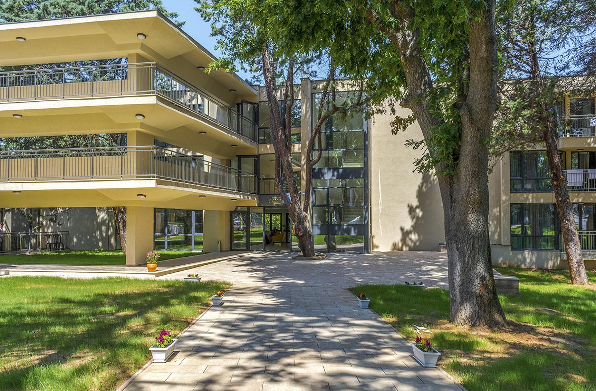 Hotel sa vyznačuje modernou architektúrou a je obklopený zeleňou,